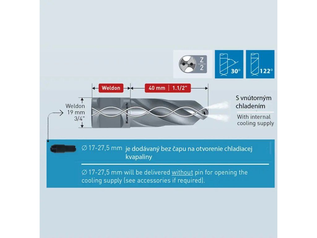A 17-27,5 mm átmérőjű változatokat a hűtőfolyadék-ellátás nyitásához szükséges csap nélkül szállítjuk (külön rendelendő 201435).