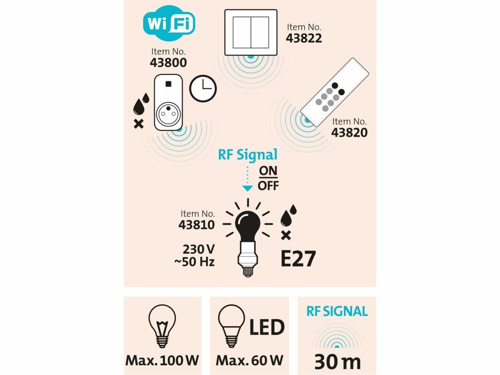 Távirányítású lámpafoglalatok (be/ki) a 43820-as RF távirányítóval, valamint a 43800-as WiFi aljzaton keresztül továbbított RF jellel (nem tartozék).