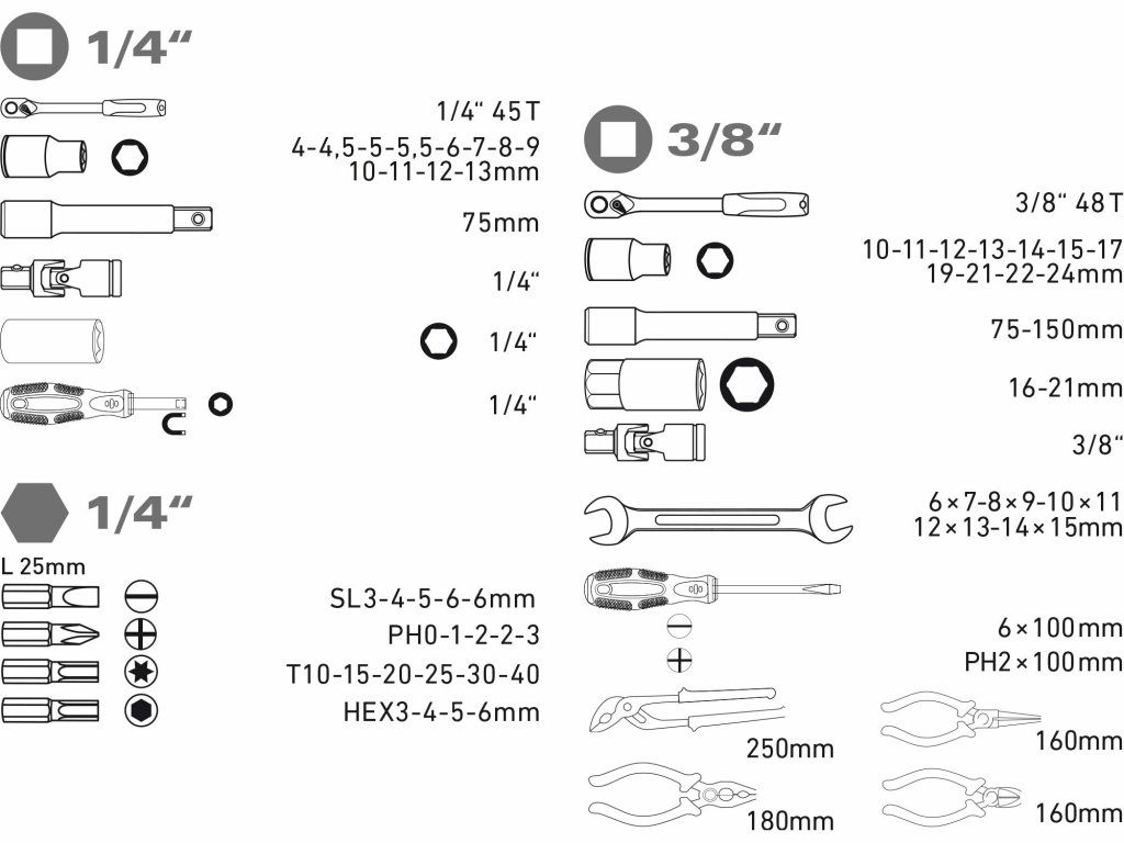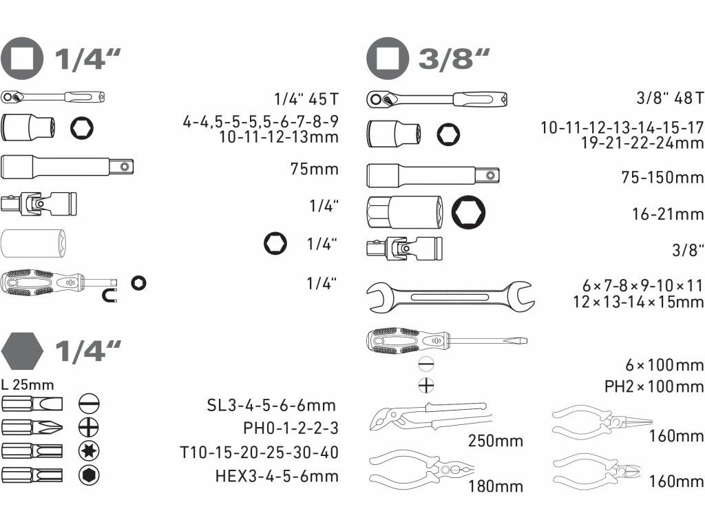 - anyagCrVracsni1/4"(45T),3/8"(45T) (CrV)dugós kulcsnyílású kulcs1/4": 4-4,5-5-5,5-6-7-8-9-10-11-12-13mm, 3/8": 10, 11, 12, 13, 14, 15, 17, 19, 21, 22, 24 mm (CrV). class="product-properties__value">1/4"x 75 mm, 3/8"x 75-150 mm (CrV)